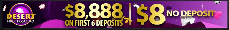 The bonus round is activated by getting three dinosaurs eggs. Clicking on each one to crack them open and reveal the value of your free spins. Desert Nights is currently offering 100% up to $8,888 on your first 6 deposits which is unheard of as usually you only get one deposit bonus but not at Desert Nights Casino.