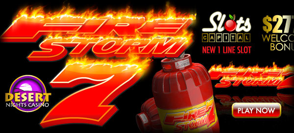 Set the world on fire with Fire Storm 7, Desert Nights Casino’s red-hot 3 reel slot. If you like to play with fire but don’t want to be burned, blaze a trail and try this sizzling slot. Icons included in this inferno are bars, gold and red sevens, a lighter, and to add more fuel to the fire, a gas can and gas tanks. The fiery fun of Firestorm 7 is almost too hot to handle.